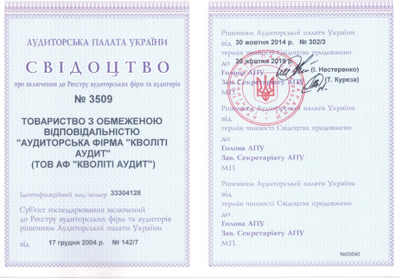 Свідоцтво про внесення в Реєстр суб’єктів аудиторської діяльності видане Аудиторською Палатою України №3509 від 17.12.2004р., продовжено рішення АПУ №302/3 до 30.10.2019р.